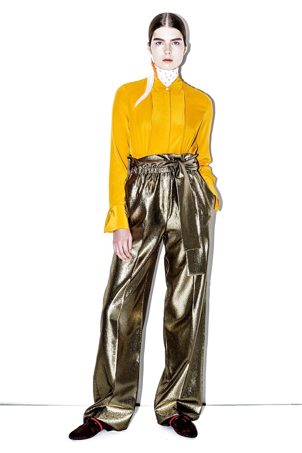 DescriptionFrom the tuxedo bib to the structured cuffs, this blouse draws on menswear influences — and tempers them in fluid crepe de chine. A gathered waist further softens the strict lines. Wear it long and loose or as a sleek evening option, tucked into a high-rise pant.