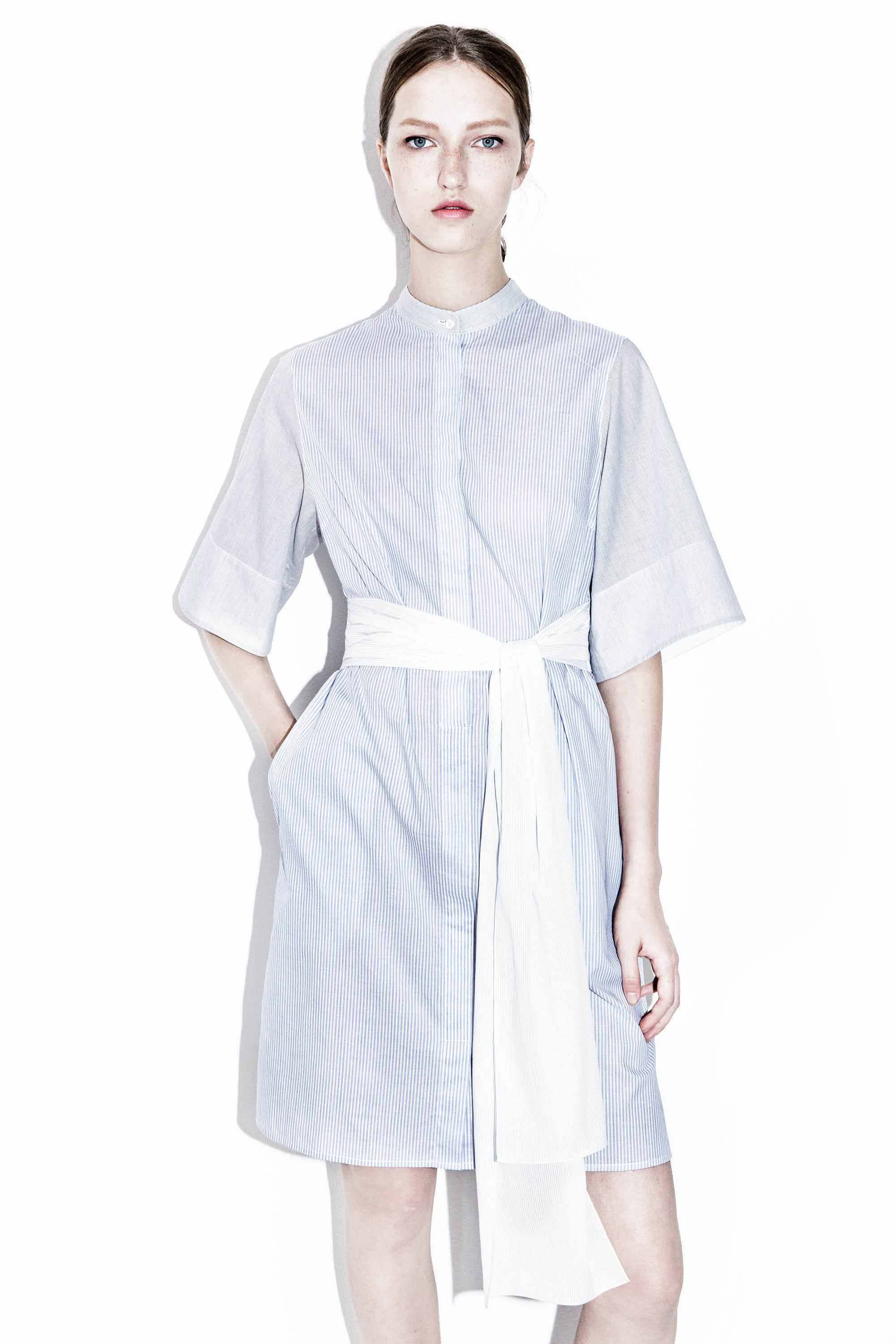 DescriptionThis collarless shirtdress draws on the boundary-pushing mood of our spring runway and reinterprets it into a more wearable, everyday style. Effortless in lightweight pinstriped cotton, it has short wide sleeves and a tie-front sash that cinches to define the waist.