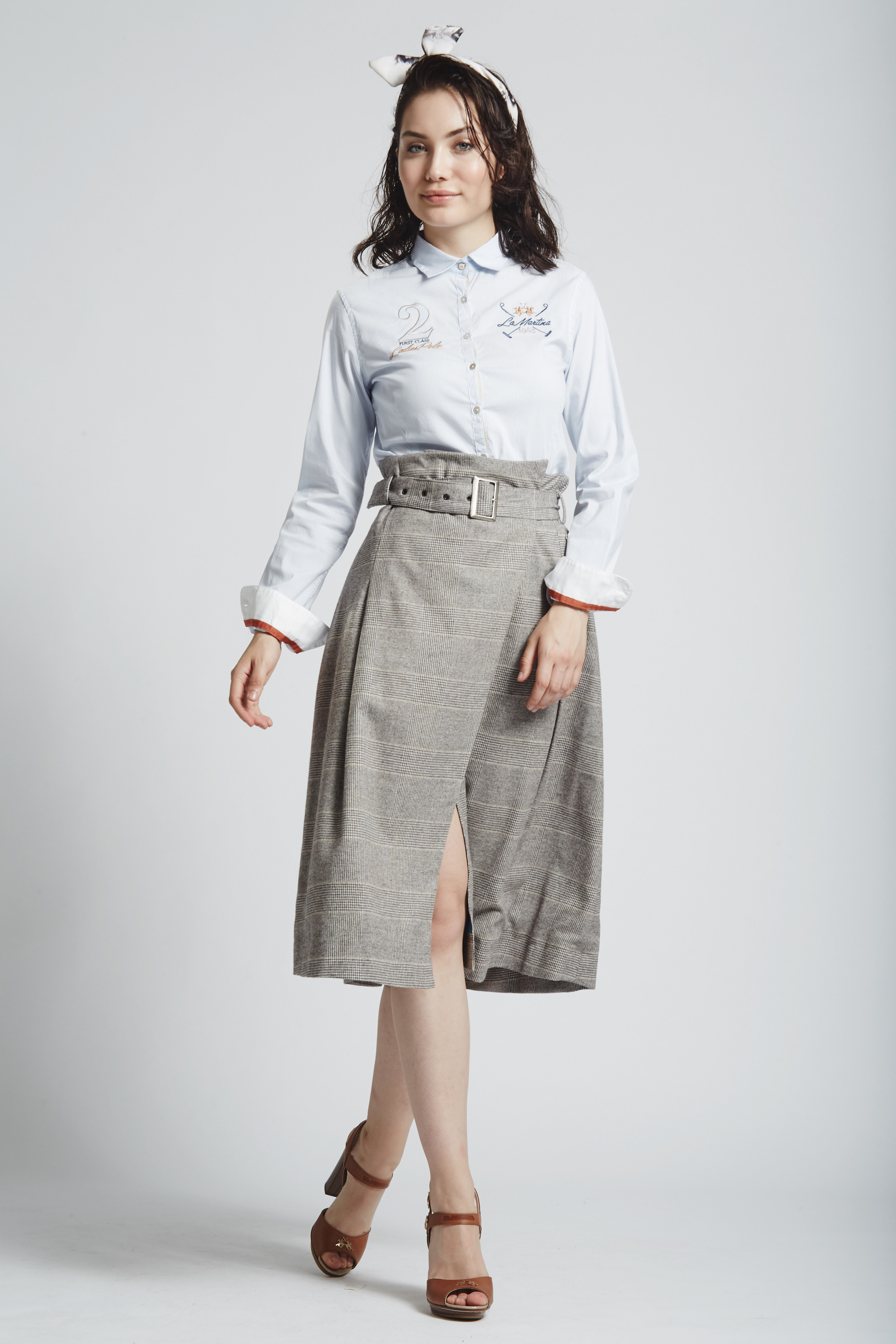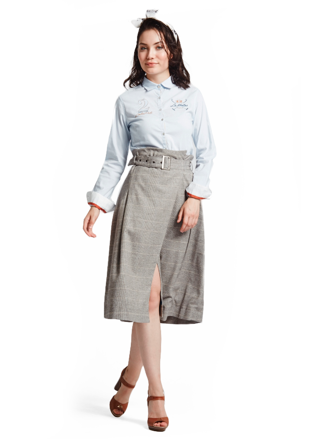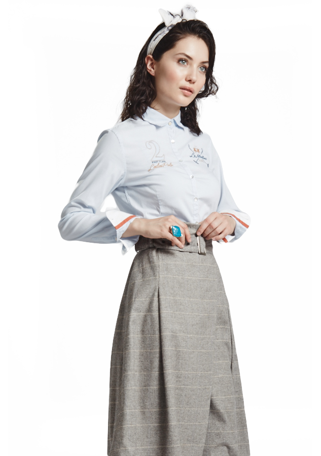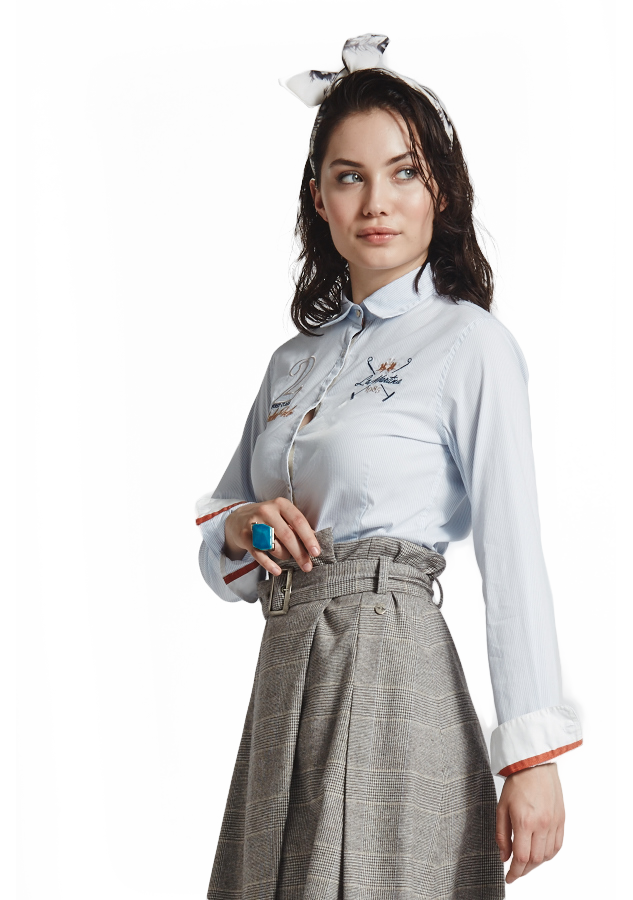 Glitter blue shirt with contrast embroideries on front and back side. You can see the logo on the left upper side and on the back, furthermore it's embroidered "2 First class Ladies Polo" on the upper left side and the colours are recalled on the cuff of the sleeve. The fabric has a striped pattern and perfectly match with high waiste dove gray trousers and ankle boots.