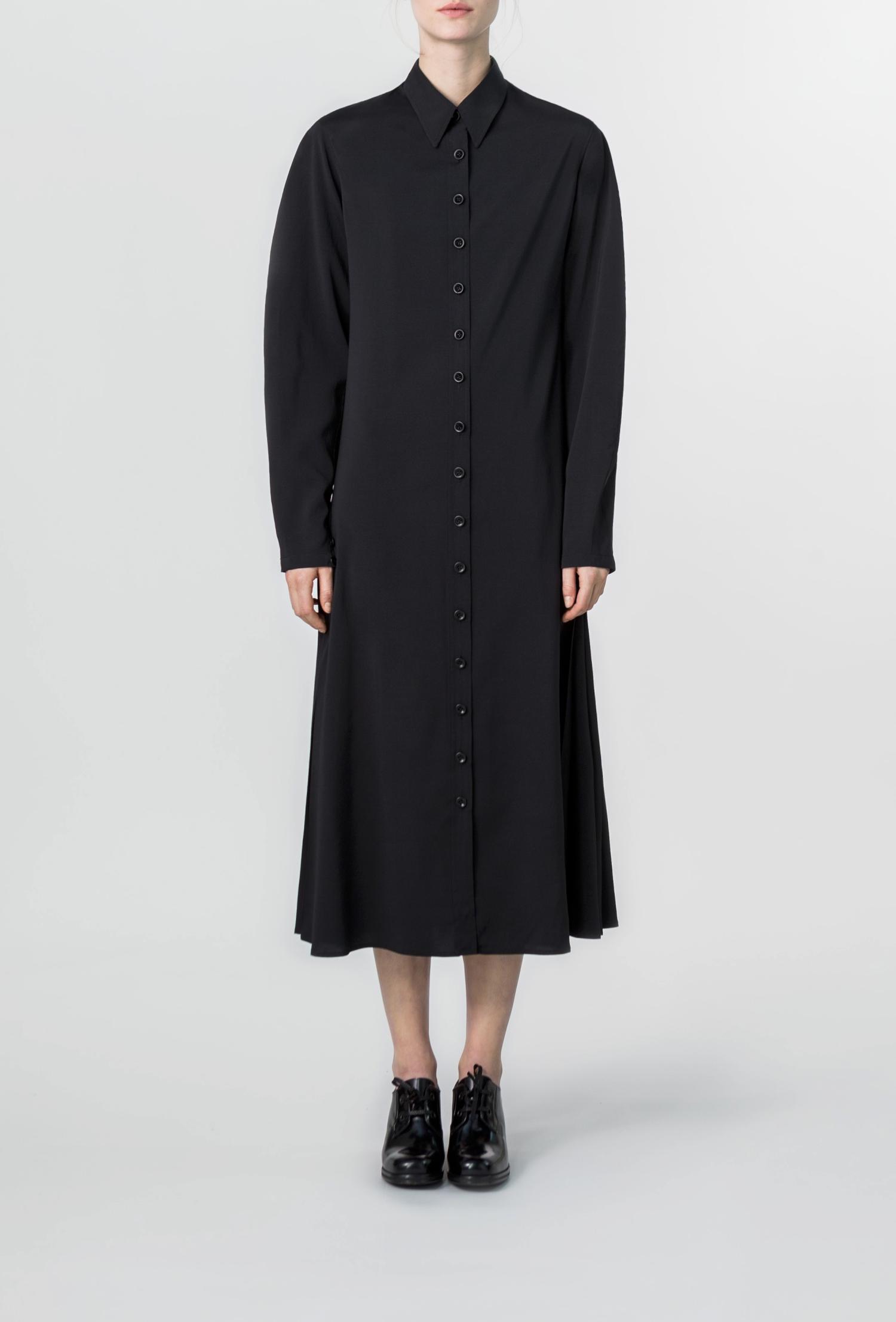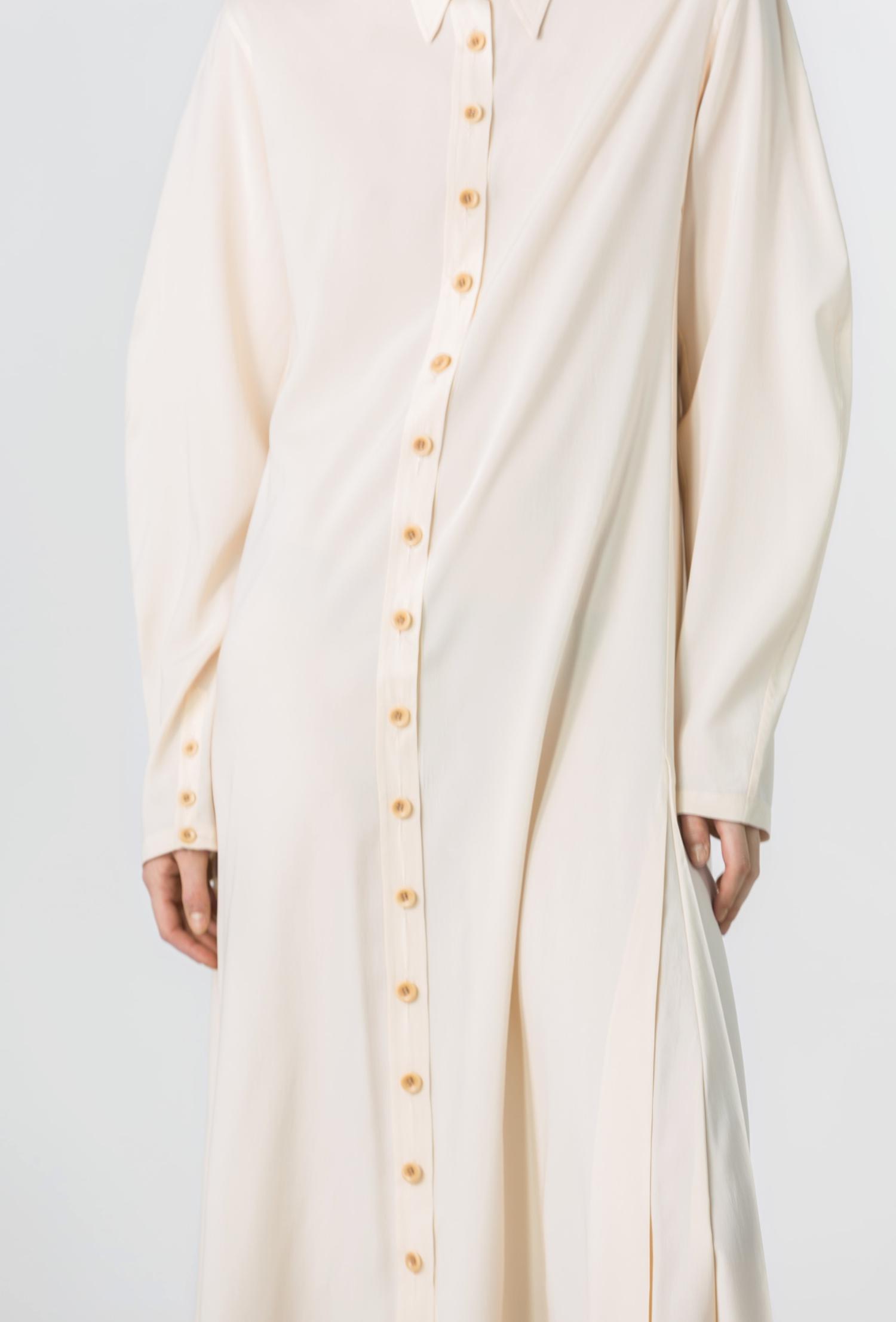 Cette robe chemise est proposée dans une soie et laine élastique, légèrement satinée, tissée en Italie. Les deux plis creux sur les côtés et le pli au milieu dos permettent plus d'aisance.